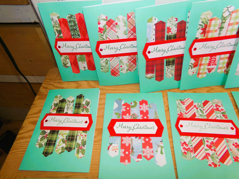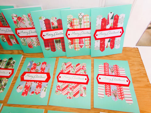 Light green cards with various Holiday-themed papers on the front. "Merry Christmas" is the elevated sentiment on the front with "Wishing You..A Wonderful Holiday Season" stamped on the inside. Set of 12, each one is unique. Each card comes with a coordinating envelope.