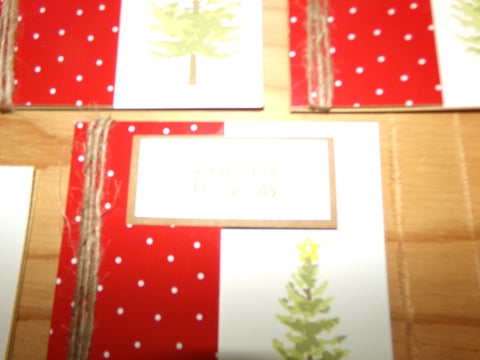 "Thinking of you at Christmas" stamped on the outside with a 2-tone tree & star and red & white polka dots. Accented by brown twine. Inside stamped sentiment "may your holiday be warm & cozy".