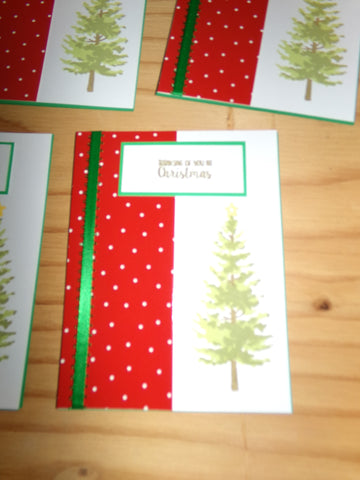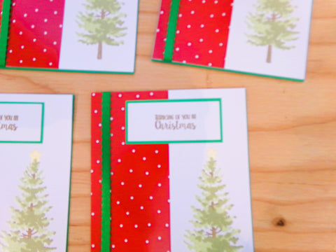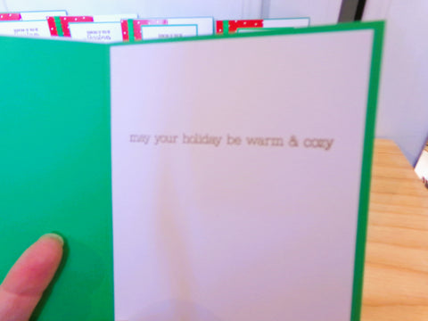"Thinking of you at Christmas" stamped on the outside with a 2-tone tree & star and red & white polka dots. Accented by green ribbon. Inside stamped sentiment "may your holiday be warm & cozy".